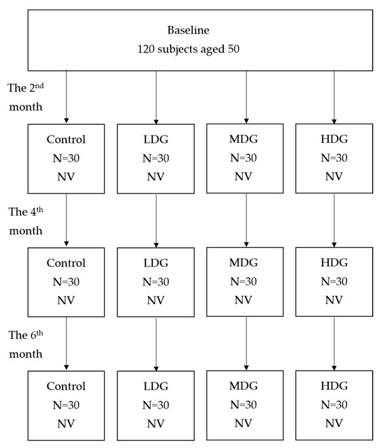 A total of 120 participants aged 50 were divided into four groups: control, LDG, MDG, and HDG, based on different doses of cassiae tea. Near vision (NV) was assessed bi-monthly.