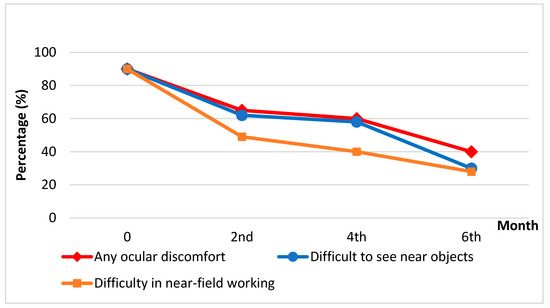 At baseline, approximately 85% of participants reported symptoms of ocular discomfort, difficulty seeing near objects, and challenges with near-field tasks. After consuming cassiae tea, these issues improved significantly. By the 6th month, the percentage of inconveniences caused by presbyopia had decreased to around 30–40%.