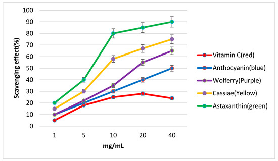 The DPPH method was used to assess the antioxidant properties of cassiae semen, wolfberry, astaxanthin, anthocyanins, and vitamin C. DPPH (2,2-diphenyl-1-picrylhydrazyl) is a stable free radical commonly used in antioxidant studies [30]. Test materials were prepared at concentrations of 1, 5, 10, 20, and 40 mg/mL in methanol. Samples were mixed with Tris-HCl buffer and DPPH-ethanol solution and incubated for 30 min. Absorbance at 517 nm was measured to calculate the scavenging effect (%) using the following equation: Inhibition (%) = [(Absorbance of Control − Absorbance of Test Sample)/ Absorbance of Control] × 100.The results were plotted with concentration on the x-axis and scavenging effect (%) on the y-axis [31].
