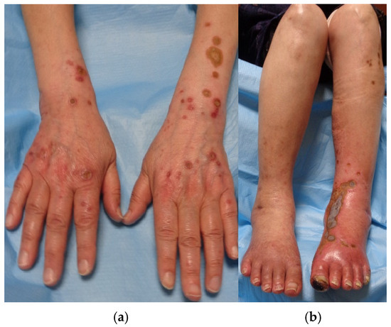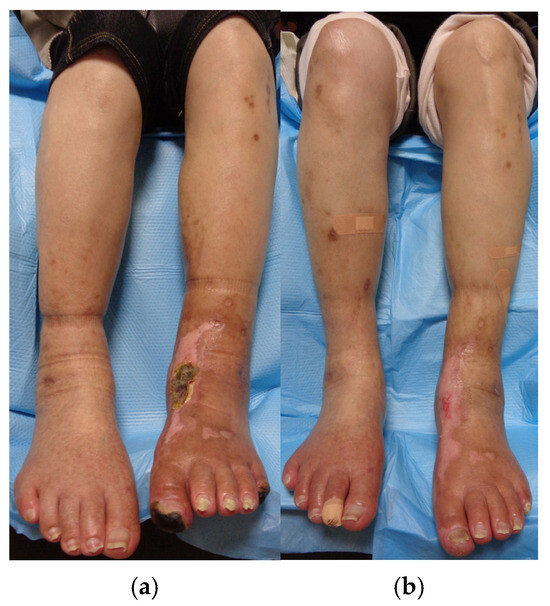 In order to control postprandial hyperglycemia and enhance insulin secretion, oral voglibose and oral sitagliptin phosphate hydrate were initiated. Due to the urgent need for rapid blood glucose reduction, insulin injections were also administered. Prior to endovascular catheter therapy, alprostadil injections, a vasodilator, were introduced to improve blood flow. After 2 months of DM treatment, with a modest improvement in hemoglobin A1c levels from 10.8% to 7.5%, the central crusts of the papules and erythema on the upper extremities tended to fade over time and become flatly pigmentated without forming ulcers or erosions. However, lesions on the lower limb remained unchanged (Figure 4a,b).
