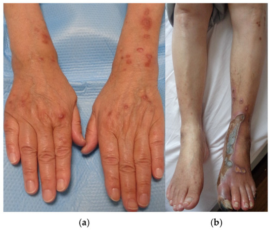 A 73-year-old Japanese woman had been diagnosed with type 2 DM over a decade ago; however, due to only mild elevations in her hemoglobin A1c (HbA1c) level, she had been managed without any medications. Approximately two years ago, she developed multiple papules on both her upper and lower extremities around the same time. These lesions proved refractory to treatment with betamethasone dipropionate ointment and oral olopatadine. Physical examination revealed multiple itchy red papules with central sebaceous plugs on her extremities, painful swelling in her lower left leg, and a black scab on her left index finger (Figure 1a,b).