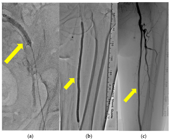 (a–c): Catheter angiography revealed the insertion of a stent into the left common iliac artery (yellow arrow) (a). Catheter angiography revealed balloon angioplasty performed on the left superficial femoral artery (yellow arrow) (b). Catheter angiography revealed enhanced blood flow in the left superficial femoral artery after endovascular therapy (yellow arrow) (c).