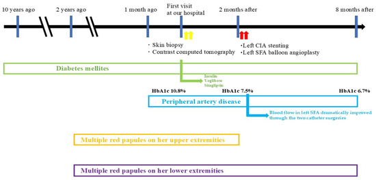 The eruptions closer to the center of the lower leg showed complete regression 3 months post-endovascular therapy; however, the erythematous area with an internal large crust still retained the crust (Figure 6a). Eruptions on the lower limbs became flatly pigmentated without central crusts 6 months post-endovascular therapy (Figure 6b). The central crust of the erythema on the lower limbs, similar to that on the upper limbs, regressed over time without presenting ulcers or erosions. The blood glucose levels remained well controlled, with HbA1c stabilizing at 6.7%. The timeline and progression of the onset of DM, PAD, and skin lesions on the upper and lower limbs are shown in Figure 7.