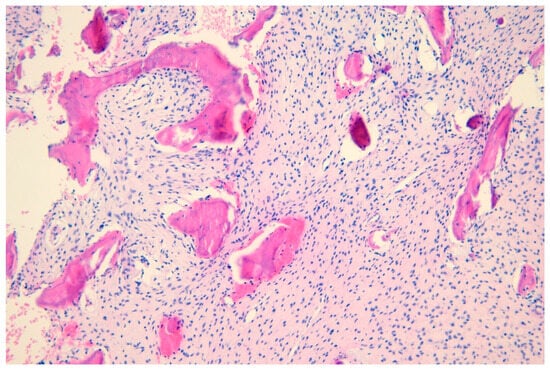 Histopathological findings. Tumor tissue composed of diffuse irregular, circular attenuated bone trabeculae on a background of fibrous tissue (H + E, ×100).