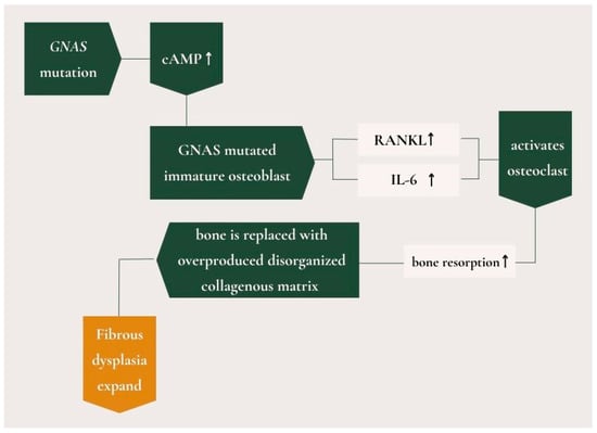 Fibrous dysplasia (FD) is an uncommon bone disorder that can impact various parts of the skeleton, primarily affecting facial and cranial bones, such as the mandible and maxilla []. An irregular mix of weak fibrous and osseous tissue replaces the normal bone marrow in the affected bones in fibrous dysplasia. The precise etiology of the disease is currently not fully elucidated [,]. However, some studies suggest that fibrous dysplasia is caused by sporadic post-zygotic mutations in the GNAS gene located on chromosome 20 [,]. The mutation disrupts the intrinsic GTPase activity of Gsα, causing receptor activation. This leads to abnormal cyclic adenosine monophosphate (cAMP)-mediated signaling, which results in elevated cAMP levels within mutated cells. Mutated osteoblastic cells overexpress the receptor activator of nuclear factor kappa-B ligand (RANKL) and interleukin-6 (IL-6), which subsequently activate osteoclasts. This activation promotes bone resorption, replacing normal bone with an overproduced, disorganized collagenous matrix, ultimately causing the FD lesion to expand [,] (Figure 1). Fibrous dysplasia has a female predilection []. This condition has three forms: monostotic (70% of cases), polyostotic (30% of cases), and the most severe form, McCune-Albright syndrome, which is defined as the combination of FD and one or more extra-skeletal features, or the presence of two or more extra-skeletal features, such as skin pigmentation manifestation and premature sexual maturation [,]. The monostotic form involves one skeletal site without extra-skeletal manifestations, usually a benign presentation encountered in the second and third decades of life. In contrast, the polyostotic form affects multiple bones without extra-skeletal manifestations [,]. It often presents with significant morbidity, thus requiring careful management to alleviate symptoms and prevent complications such as fractures or deformities associated with the condition []. Isolated monostotic bone lesions have a wide differential diagnosis and often involve diagnostic uncertainty, usually require histological confirmation. Moreover, in some cases a molecular diagnosis of affected tissues is indicated (Figure 2). Management strategies for fibrous dysplasia typically involve a multidisciplinary approach, including orthopedic intervention, pharmacological treatment for pain relief, and regular monitoring to assess potential complications, such as osteosarcoma, in patients with the polyostotic form of the disease.