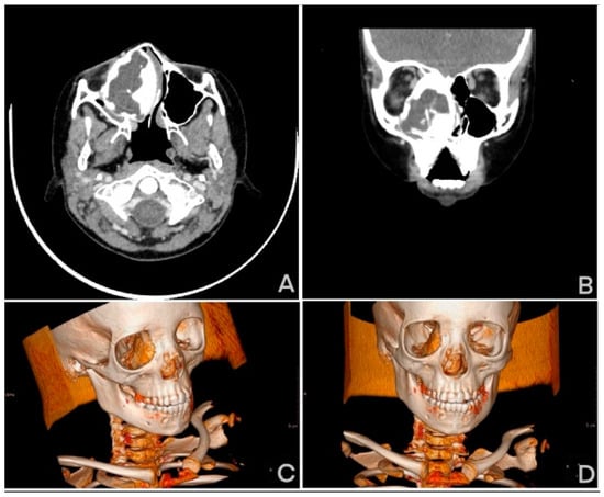 CT image in: (A) sagittal projection, (B) frontal, (C,D) 3D image reconstructions.