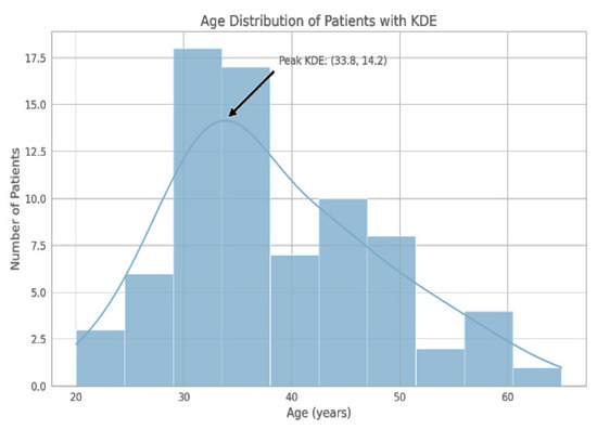 The histogram delineates the frequency of participants by age group, with the largest number of individuals falling within the 30–40 year age range. KDE represents a smoothed density curve, with its mode in the vicinity of 33.8 years.
