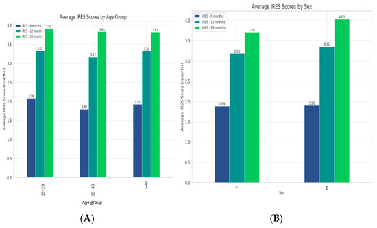 (A). Trends in VNS therapy effectiveness across age groups, with all experiencing improvements over time and the 30–40 age group showing the highest average IRES scores. (B). Therapy’s efficacy between genders, revealing a slightly stronger long-term response in males.