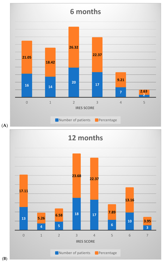 At the 6-month assessment, the majority of patients (65.79%) scored between 0 and 2 on the IRES scale, reflecting minimal or no therapeutic response, with limited benefits in seizure reduction. A smaller proportion (34.21%) achieved scores between 3 and 6, indicative of a partial therapeutic response. No patients scored between 7 and 8 at this stage, signaling the absence of a substantial treatment effect (Figure 3A).