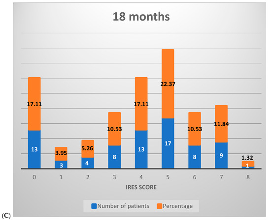 Distribution of IRES scores among patients following VNS therapy: (A) 6 months, (B) 12 months, (C) 18 months.