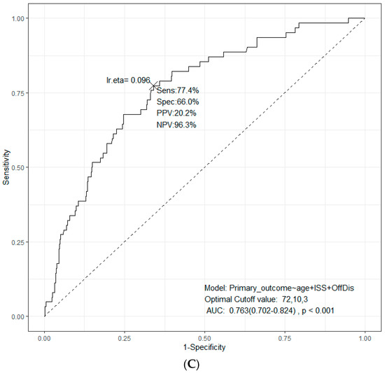 Receiver operating characteristic (ROC) analysis for the primary outcome. (A) ROC curve for the original parameters, including age, AIS head, ISS, and completely displaced RFXs. (B) ROC curve for the 50% threshold criteria with a combined parameter (G2 or higher), excluding the parameter of completely displaced RFXs. (C) ROC curve for the 10% threshold criteria with a combined parameter (Offset or higher), excluding the parameter of completely displaced RFXs.
