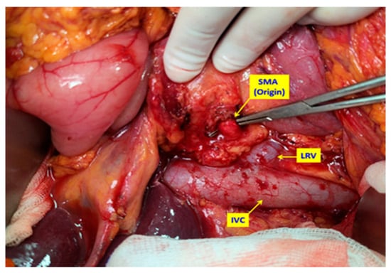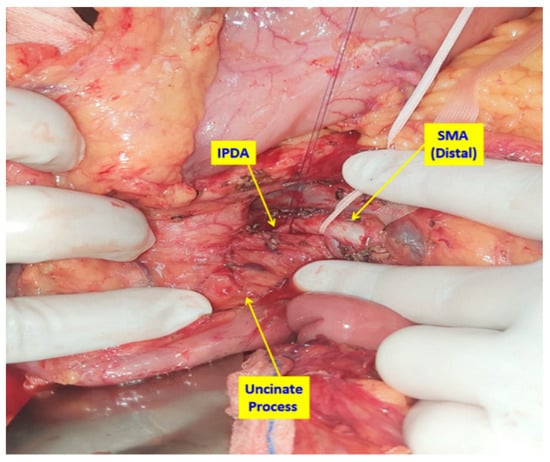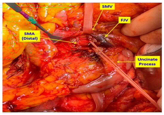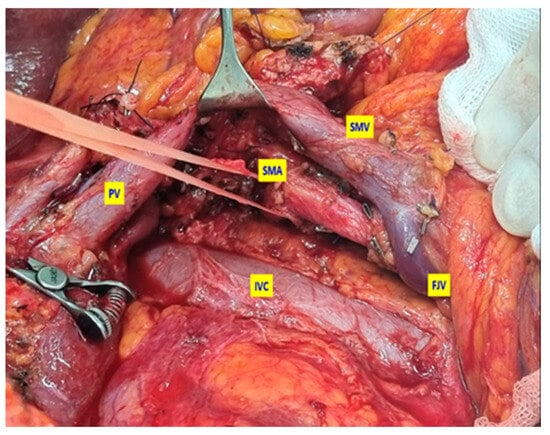In patients undergoing conventional PD (Whipple procedure), the standard, previously described surgical technique was applied []. In TMpE-PD cases, surgery was initiated with an artery-first approach. Following a wide Kocher maneuver, the superior mesenteric artery (SMA) was dissected posteriorly, encircled, and suspended. The dissection was extended distally via the uncinate process, allowing both distal and proximal control of the SMA (Figure 1 and Figure 2). Dissection proceeded in a caudo-cranial manner along the pancreatic border toward the SMA origin, at which point the artery was assessed for tumor invasion.