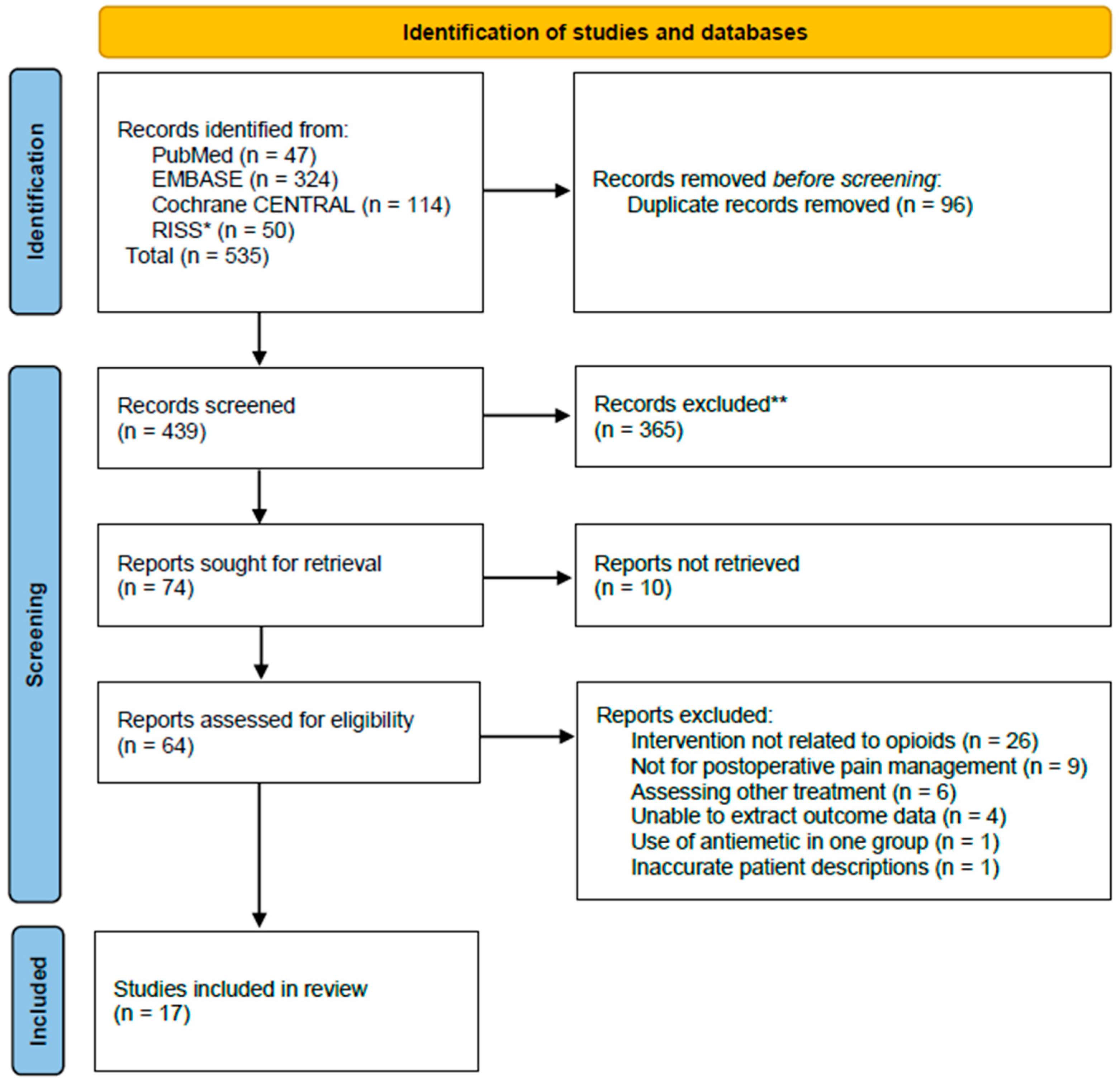 We searched PubMed (NLM®), EMBASE (OvidSP), the Cochrane Library (Cochrane), and RISS (Korea Education and Research Information Service) from their respective inception dates to July 2025. The complete search strategy is presented in Table S1. To ensure comprehensiveness, all available opioid agents listed in accredited pharmaceutical databases, including Micromedex (Merative™, Ann Arbor, MI, USA), were included as keywords across all search fields. All retrieved studies were managed using EndNote 20 (Clarivate, Philadelphia, PA, USA) to facilitate systematic screening and identification. A language filter was applied only to English-language publications.