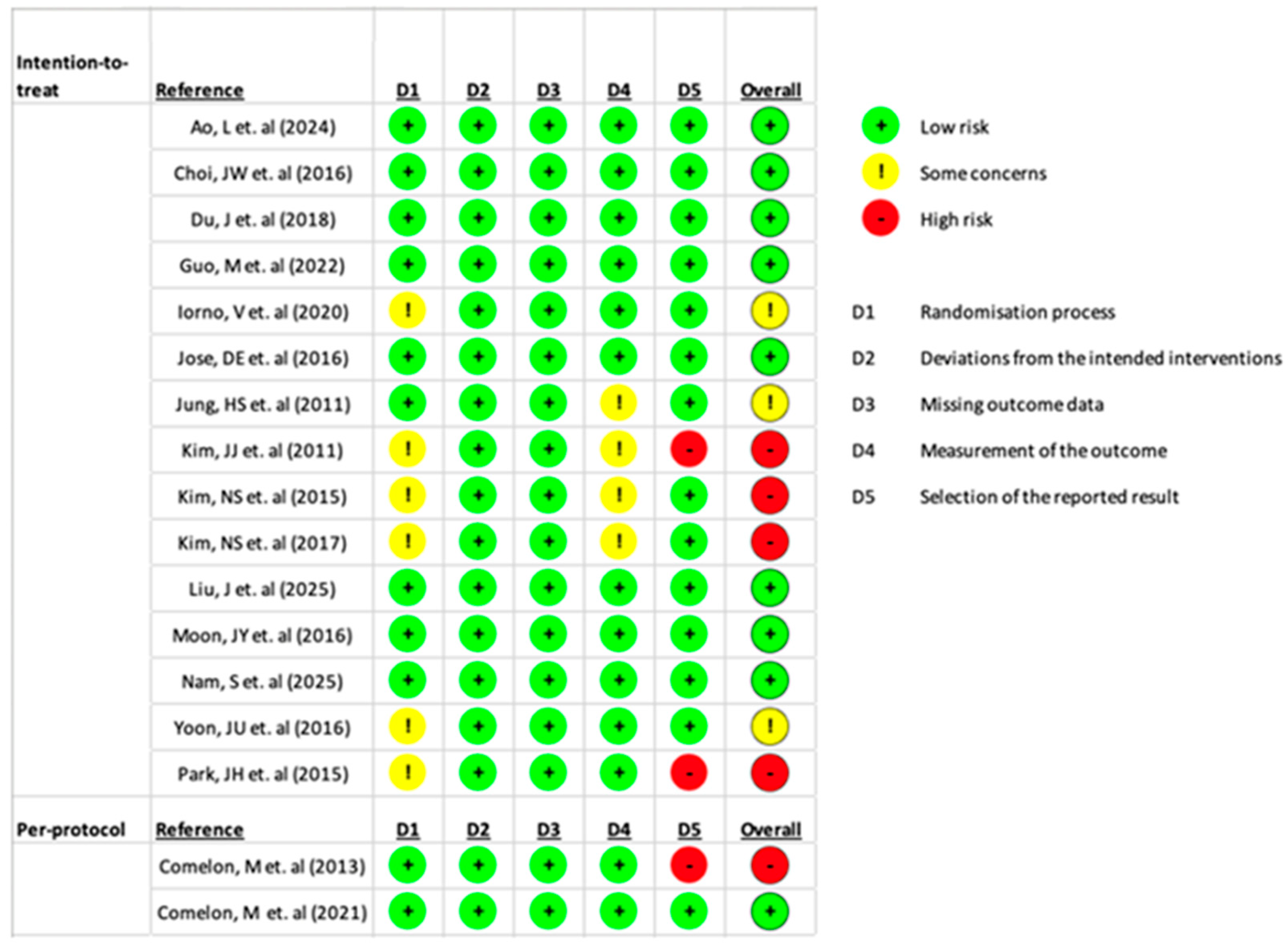 The risk of bias in the included studies was assessed using the Cochrane Risk of Bias 2 tool [17]. This tool includes five domains: bias arising from the randomization process, deviations from intended interventions, missing outcome data, measurement of the outcome, and selection of the reported result. Each domain was rated as “low,” “some concerns,” or “high” for each study. Two authors (H.aB. and S.C.) independently assessed the risk of bias in all included studies in accordance with the guidelines. Any discrepancies were resolved through discussions with a third author (E.L.).