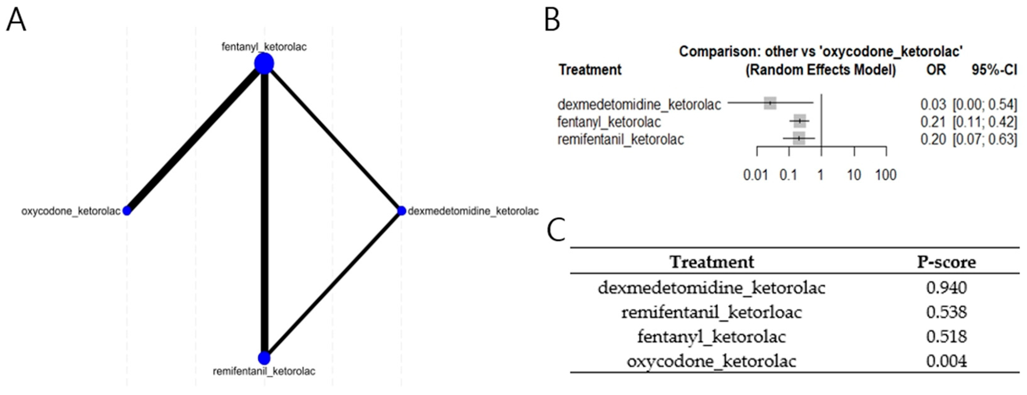 Four studies of ketorolac-containing combination regimens were available for NMA synthesis. Compared with the oxycodone/ketorolac combination regimen, other ketorolac-containing combination regimens showed a lower risk of nausea or vomiting: dexmedetomidine/ketorolac (odd ratio [OR] = 0.0267 [95% confidence interval (CI): 0.0013–0.5442]), fentanyl/ketorolac (OR = 0.2106 [95% CI: 0.1059–0.4188]), and remifentanil/ketorolac (OR = 0.2034 [95% CI: 0.0661–0.6259]) (I2 = 0%; Figure 4). This inconsistency was not statistically significant (p = 0.96).