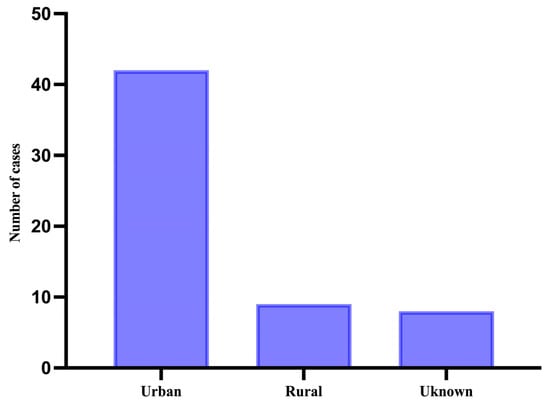 In terms of demographics, 9 patients were from rural areas (15.3% of all patients), 42 were from an urban setting (71.2% of all patients), and 8 did not disclose their environment (13.6% of all patients) (Figure 2).