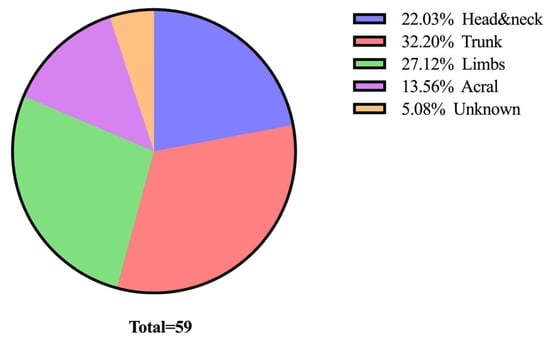 The most common location for tumours was the trunk, which accounted for 19 cases. This was followed by the limbs with 16 cases, and the head and neck region, which had 13 cases. Tumours were also frequently located in the acral region, with 8 cases reported. Finally, in 3 cases, the tumour location was not specified (Figure 3).