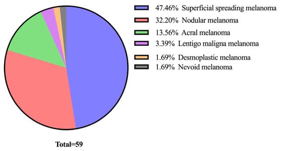 Superficial spreading melanoma was the most common subtype, which is consistent with findings from other studies [,]. However, the low incidence of lentigo maligna melanoma and the high incidence of acral lentiginous melanoma, in contrast to other studies [,], are observations that warrant further investigation.