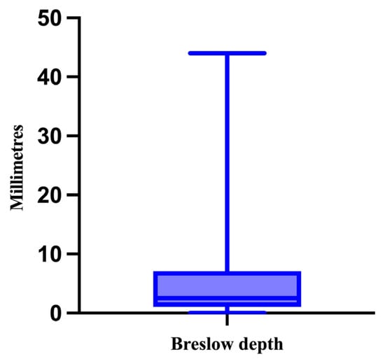 The next histopathological feature that was analyzed was the Breslow depth of invasion, ranging from 0 mm for in situ melanomas to 44 mm, with a median of 2.5 mm (Figure 5).