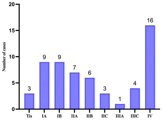 Based on the Breslow depth of invasion and clinical assessment, the TNM staging was established. Out of the cases reviewed, 16 (n = 16) were diagnosed with metastatic disease, as illustrated in Figure 6.