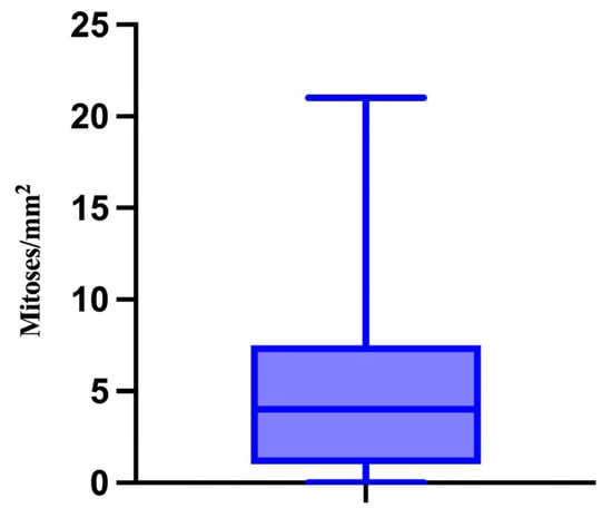 Furthermore, we also analyzed the number of mitoses/mm2. The minimum value was 0 and the maximum value was 21, with a median of 4 mitoses/mm2 (Figure 7).