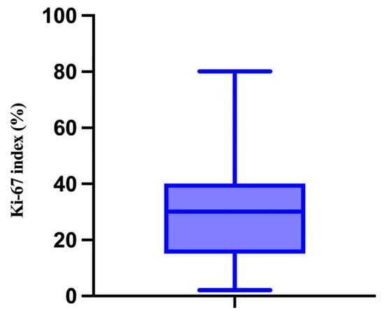 Ki-67 was first identified as a nuclear antigen present in Hodgkin lymphoma cells [], and is known for its elevated expression in proliferating cells, while being markedly reduced or absent in quiescent cells in the G0 phase of the cell cycle []. Due to this pattern, Ki-67 has become a widely accepted marker for evaluating cell proliferation and is commonly used in the histological grading of various malignancies, with numerous studies confirming its prognostic relevance [,,]. While Ki-67 has a well-established role in other cancers, its prognostic value in cutaneous melanoma remains unclear due to inconsistent findings in the literature. Nevertheless, more recent investigations suggest that Ki-67 may be helpful for risk stratification in melanoma patients [,,].