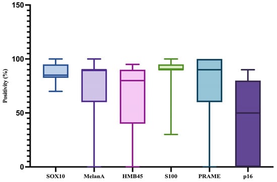 Graphical representation of the minimum, maximum, and median percentage of positive cells for SOX10, Melan-A, HMB45, S100, PRAME, and p16.