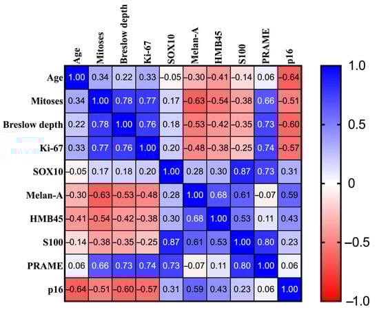As illustrated in Table 2, several statistically significant correlations are evident. Firstly, the number of mitoses shows a significantly positive association with patient age, Breslow depth of invasion, Ki-67 index, and PRAME expression. On the other hand, there are significant negative correlations between the mitotic index and the expression of Melan-A, HMB45, and S100. Furthermore, an increase in Breslow depth is significantly correlated with both an increase in the Ki-67 index and PRAME expression, as well as a decrease in the expressions of Melan-A, HMB45, S100, and p16. There are also significant negative correlations between the Ki-67 index and the expressions of Melan-A, HMB45, and p16. Notably, positive correlations between the Ki-67 index and both patient age and PRAME expression are also significant. Regarding melanocytic markers, SOX10 is positively correlated with PRAME, while Melan-A expression is significantly correlated with both HMB45 and S100. Additionally, HMB45 is also correlated with S100. Finally, a significant negative correlation exists between p16 expression and patient age.