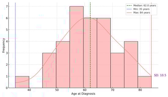 Regarding the age of patients at the time of diagnosis, we observed a median age of 62, indicating that half of the patients were diagnosed before this age. In contrast, the other half were diagnosed afterward. The youngest patient was 35, and the oldest was 84. The standard deviation of 10.5 years suggests moderate variability in the ages of the patients in this dataset. The age distribution follows an approximately regular pattern, with a peak in the 60- to 70-year age range. The density curve (KDE) overlaid on the frequency histogram highlights this trend, indicating that most patients were diagnosed between the ages of 50 and 70 (Figure 1).
