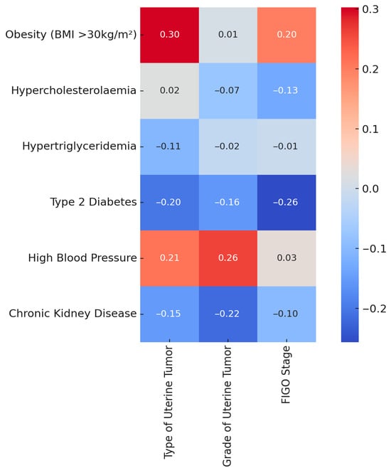 Spearman’s correlation heatmap illustrating associations between comorbidities (e.g., obesity, hypertension, diabetes) and tumor characteristics (histologic type, grade, FIGO stage). Correlation coefficients are shown, though none reached statistical significance after FDR correction. Due to the small sample size, these findings are considered an exploratory analysis. Figure 2 shows a moderate, but statistically nonsignificant, association between obesity and tumor type (ρ = 0.30, p = 0.08; adjusted p = 0.2057). All other correlations with tumor grade or FIGO stage, including those involving diabetes, hypertension, hypercholesterolemia, and chronic kidney disease, were weak and not statistically significant after adjustment for multiple comparisons.