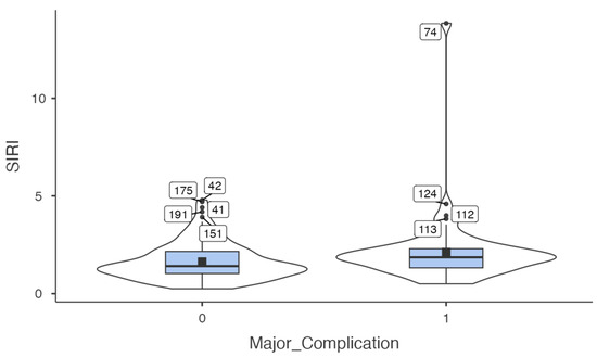Violin plot showing the distribution of SIRI values in patients with and without major postoperative complications.