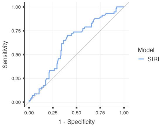 To further assess the predictive performance of the multivariate logistic regression model, a receiver operating characteristic (ROC) curve was constructed. The area under the curve (AUC) was calculated as 0.676, indicating fair discriminative capacity for predicting major postoperative complications. This suggests that the combined model—including SIRI and clinical variables—offers improved prognostic performance compared to SIRI alone. The overall diagnostic performance of the multivariate model is illustrated in Figure 3.