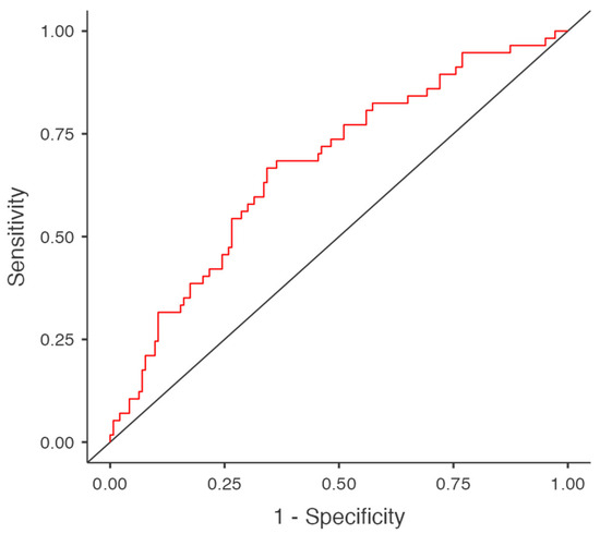 ROC curve demonstrating the predictive performance of the multivariate logistic regression model for major complications after radical cystectomy (AUC = 0.676). The red line represents the ROC curve, while the grey diagonal line indicates the reference line (AUC = 0.5), corresponding to no discriminative ability.