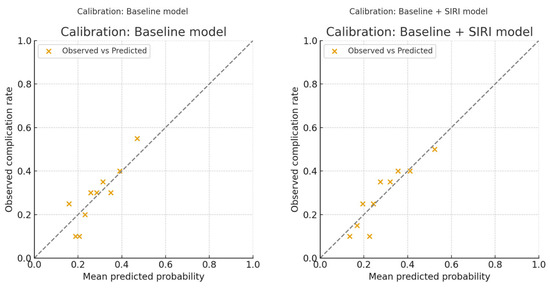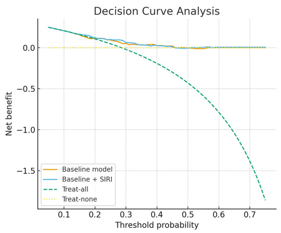 Incremental value analyses further supported the contribution of SIRI, with a statistically significant improvement in integrated discrimination improvement (IDI = 0.024, 95% CI 0.000–0.053, p = 0.024) and a positive but non-significant net reclassification improvement (NRI = 0.081, 95% CI −0.031 to 0.193, p = 0.086). The comparative performance of the different models is summarised in Table 6. Calibration plots illustrating agreement between predicted and observed probabilities are shown in Figure 4, while Figure 5 presents the decision-curve analysis, which confirmed a higher net clinical benefit for the SIRI-augmented model compared with the baseline model, particularly in the threshold probability range of 0.15–0.45. Calibration-in-the-large demonstrated an intercept of 0.07 (95% CI −0.53 to +0.67) and a slope of 1.08 (95% CI 0.50 to 1.66), indicating good overall calibration without systematic bias or attenuation of predictions. Restricted cubic spline analysis (df = 3) and a Box–Tidwell transformation further confirmed no evidence of non-linearity (LR = 0.23, p = 0.97; Box–Tidwell p = 0.40), supporting the treatment of SIRI as a continuous linear predictor.