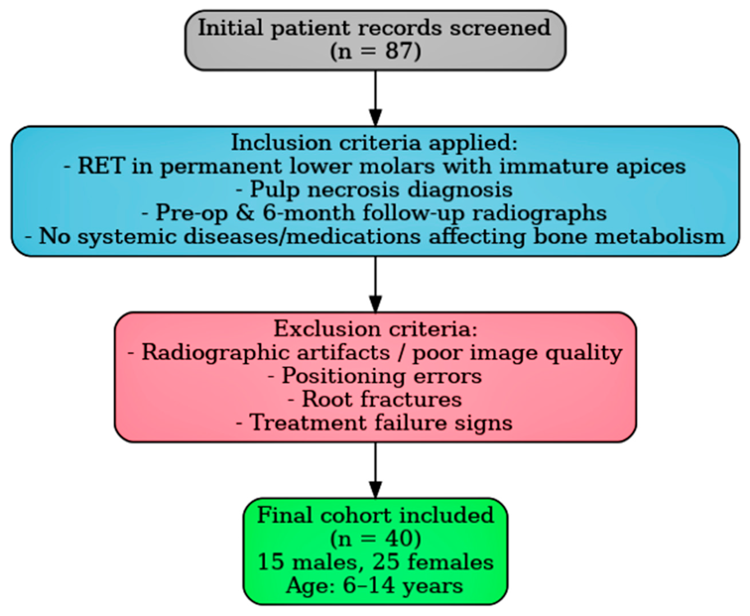 Inclusion criteria mandated that regenerative endodontic procedures were exclusively performed on permanent lower molars with immature apices and a diagnosis of pulp necrosis. Additionally, high-quality digital panoramic radiographs were available for both time points, and patients had no systemic conditions or were on medications known to affect bone metabolism. Exclusion criteria encompassed radiographic artifacts, errors in patient positioning, insufficient image quality, diagnosed root fractures, and any clinical or radiographic signs indicative of treatment failure. A detailed patient selection flowchart is presented in