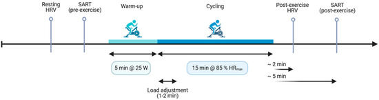 Experimental timeline. After questionnaires, a 2 min resting ECG was recorded for HRV analysis, followed immediately by the pre-exercise SART. Participants then completed a 5 min warm-up at 25 W, after which workload was adjusted over ~1–2 min to reach and maintain 85% of age-predicted HR max for 15 min of cycling. Within ~2 min of exercise cessation, a second 2 min ECG was obtained (post-exercise HRV), followed by the post-exercise SART (~5 min). The entire laboratory visit was conducted in the morning (8:00–12:00) and lasted approximately 60 min.