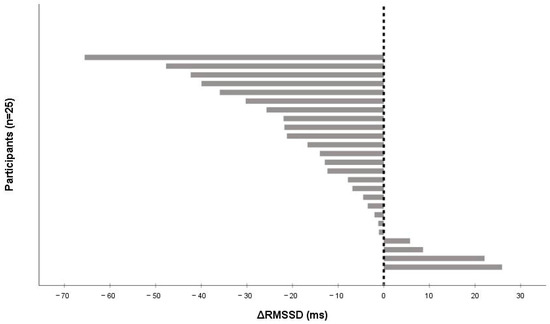 Individual changes in RMSSD (ΔRMSSD) from pre- to post-exercise after a 15 min moderate-to-vigorous submaximal cycling bout (n = 25). Bars are sorted from the largest decrease to the largest increase; negative values indicate vagal (parasympathetic) withdrawal. The vertical line denotes zero change.