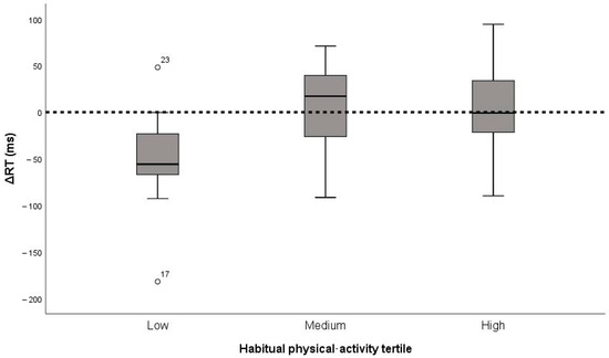 Change in reaction time (ΔRT) after the 15 min cycling bout by habitual physical activity tertile (low, medium, high; n = 29). Boxes show medians and inter-quartile ranges; whiskers represent 1.5 × IQR. The horizontal line denotes zero change (no effect).