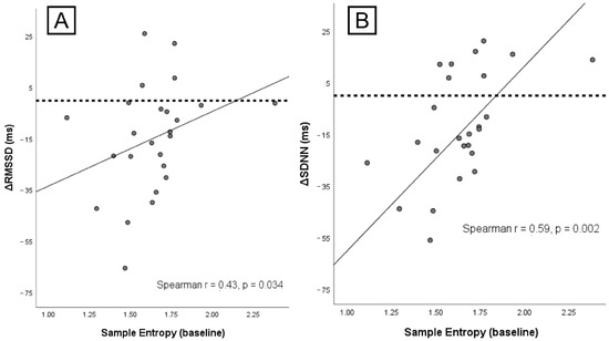 Associations between baseline HRV complexity and autonomic change. (A) Sample Entropy at rest vs. ΔRMSSD (r = 0.43, p = 0.034). (B) Sample Entropy at rest vs. ΔSDNN (r = 0.59, p = 0.002). Lines show linear fits; points are individual participants. Negative Δ values indicate larger vagal withdrawal.