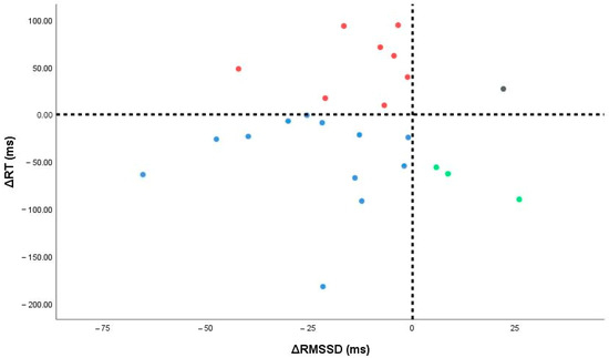 Individual changes in autonomic (ΔRMSSD) and cognitive (ΔRT) measures. Vertical and horizontal lines denote zero change; points fall into four responder quadrants (dual, autonomic-only, cognitive-only, non-responders).