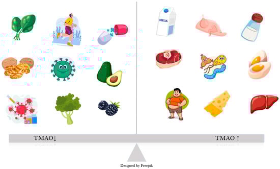 TMAO is a dietary-derived amine oxide, formed as an oxidized product of TMA. In the gut, choline, betaine, and L-carnitine are converted by the bacteria into TMA, which is absorbed into the bloodstream and directed mostly towards the liver, where it becomes oxidized through hepatic flavin monooxygenases (FMO) to TMAO [15]. Sources of dietary carnitine and choline include animal products, especially eggs, red meat, fish, and dairy (Figure 1) [16]. A small percentage of TMA is also converted locally, in the intestine, to ammonia, methylamine, and dimethylamine [8]. TMAO is mostly excreted through urine, with a very small percentage from sweat, stool, and respiration [17].