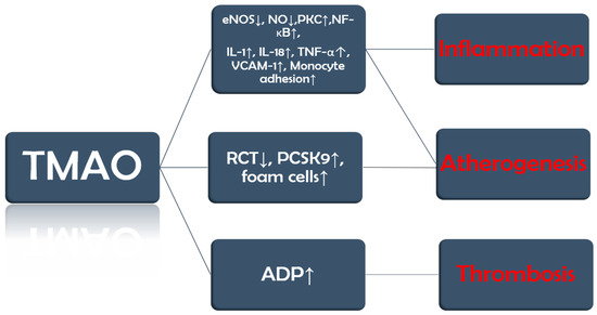 TMAO promotes endothelial dysfunction by reducing the activity of endothelial nitric oxide synthase (eNOS) and the production of nitric oxide (NO). Furthermore, it also activates protein kinase C (PKC), which further stimulates the nuclear factor kappa-light-chain-enhancer of activated B cells (NF-κB) pathway. These changes lead to the release of inflammatory cytokines, such as interleukin-1 (IL-1), IL-18, and tumor necrosis factor α (TNF-α), and upregulation of vascular cell adhesion molecule-1 (VCAM-1), which increases monocyte adhesion [22,23].