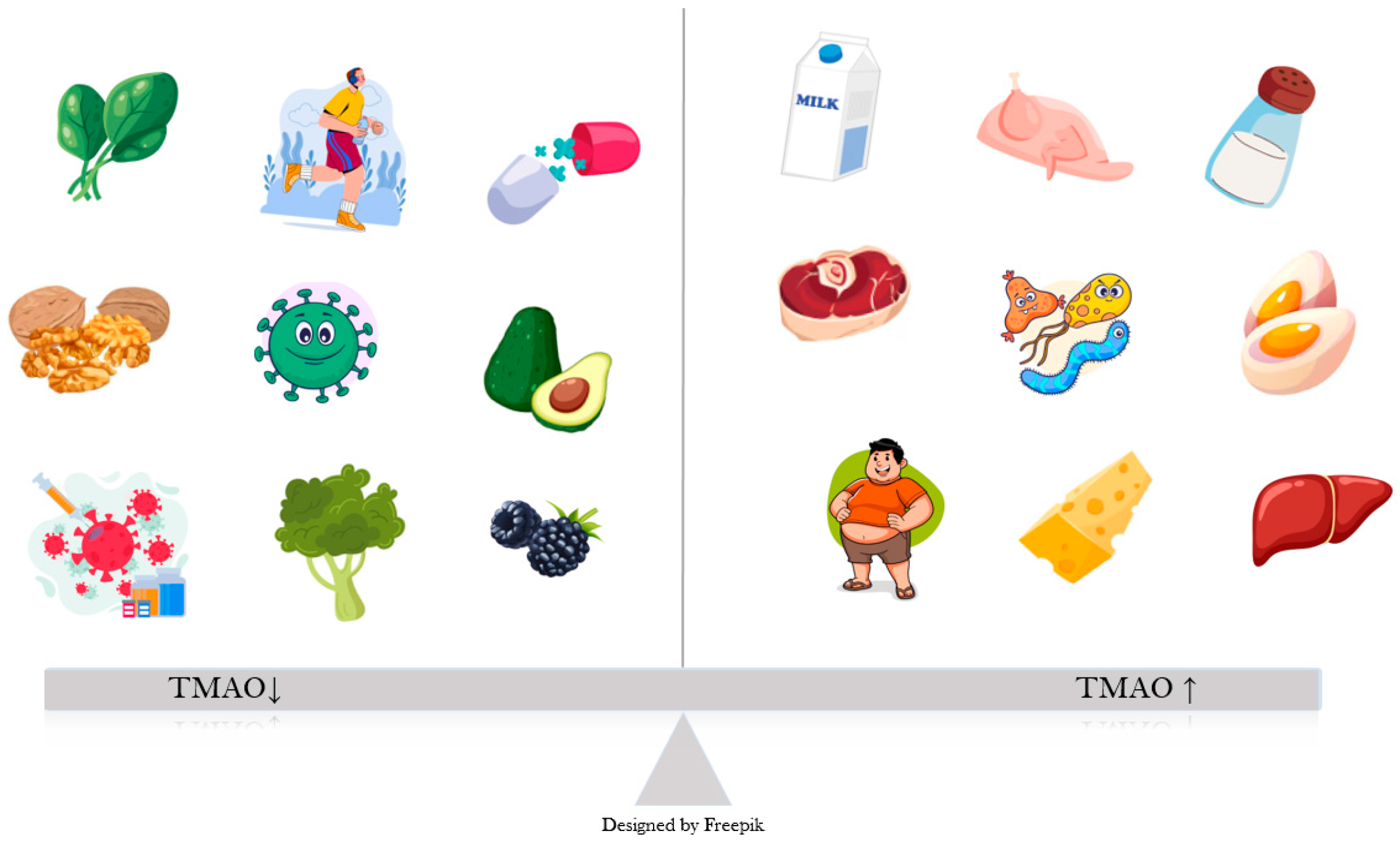 Increases in TMAO are associated with negative alterations in gut microbiota, particularly in the ratio of beneficial to harmful bacteria, as well as with a higher incidence of CVD [8,9,10,11]. At the other end of the spectrum, studies in which TMAO levels decreased—either through dietary restriction or probiotic supplementation—have shown improvements in both the gut microbiome and cardiovascular outcomes [12,13]. While studies have attempted to isolate the effects of TMAO, we are still far from fully understanding its role in CVD [14].