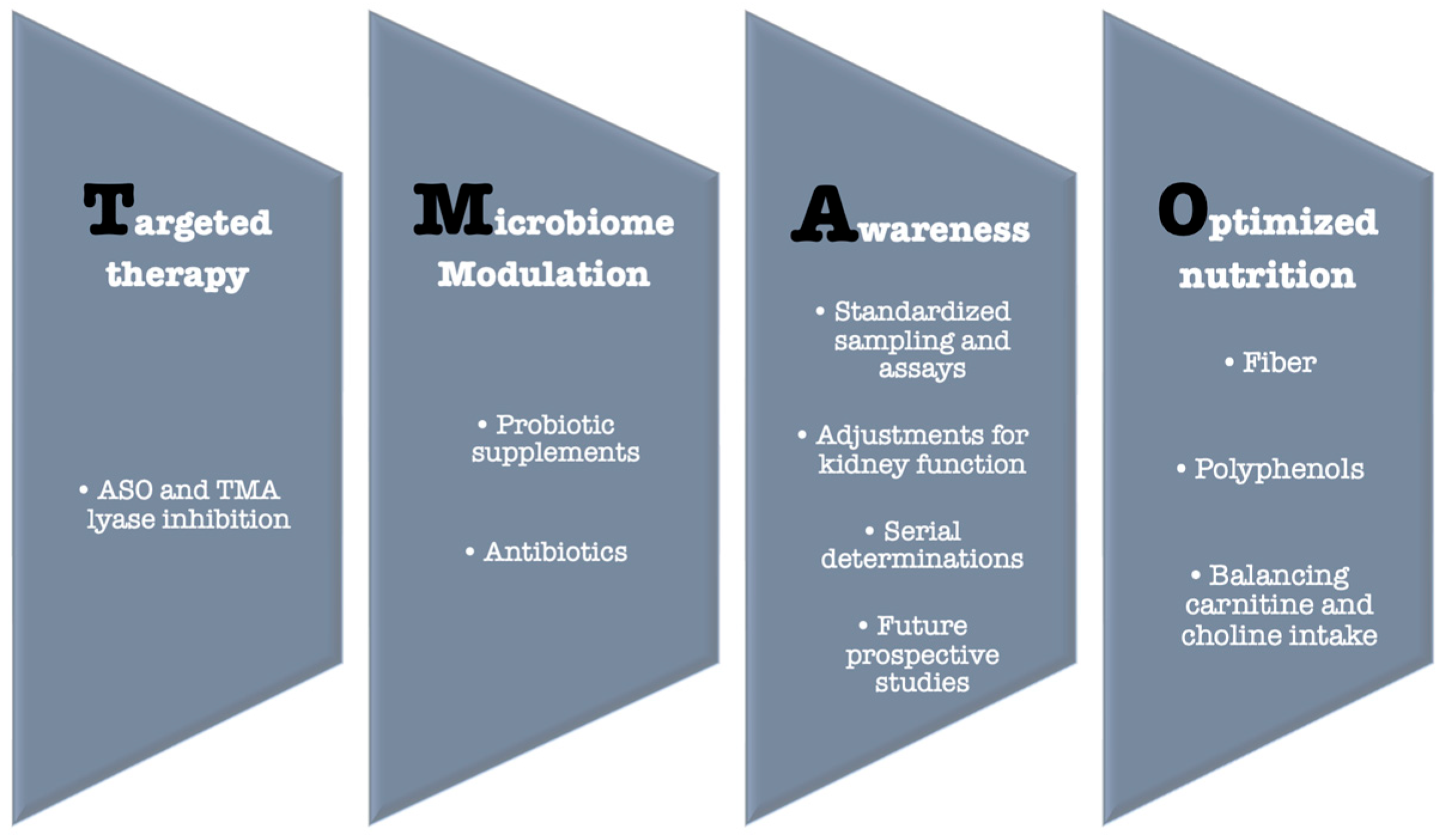 A meta-analysis of eight studies with a total of 11750 subjects from multiple geographical areas, published in 2020, suggested a possible association between TMAO and hypertension but could not clearly elucidate the underlying mechanisms involved, instead postulating several pathways involving inflammation, atherosclerosis, and the microbiome. While the authors selected high-quality studies, information regarding dietary intake was lacking. Furthermore, all included studies were conducted in populations with high cardiovascular risk, which differs from healthy individuals—limiting the generalizability of the findings to the broader population, who would arguably benefit the most from preventive strategies [43]. Future prospective studies including individuals with lower cardiovascular risk, accounting for dietary intake, standardized TMAO sampling, and renal function adjustments, are needed.