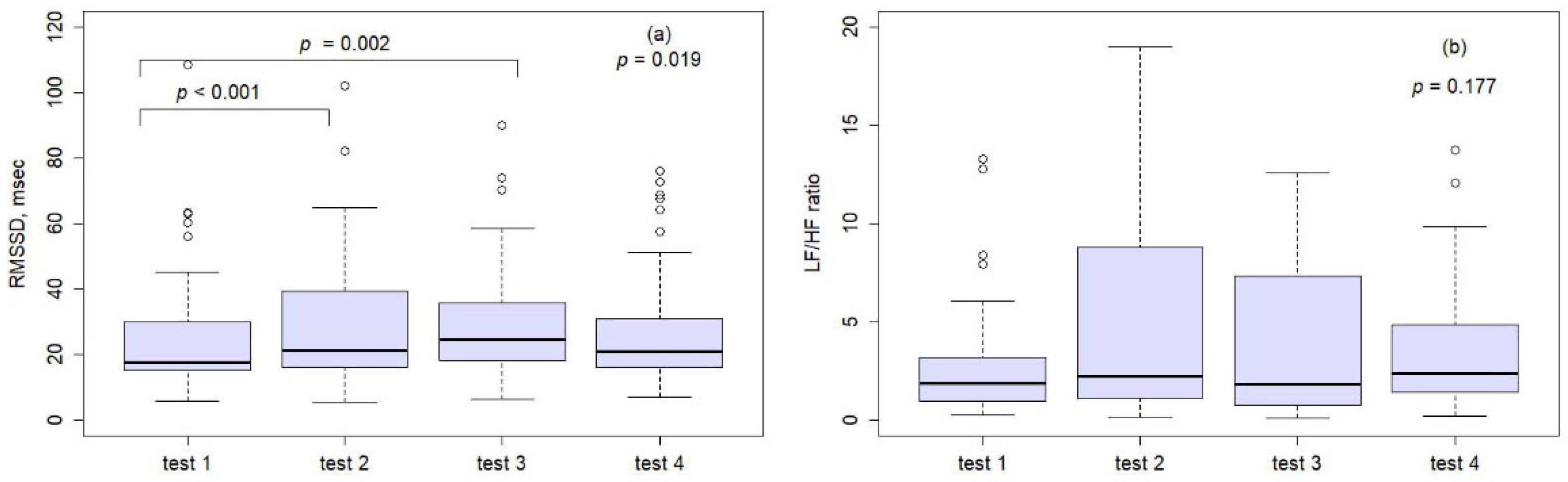 Variables | LF | HF | lnHF | LF/HF, Mean | RMSSD, Msec |