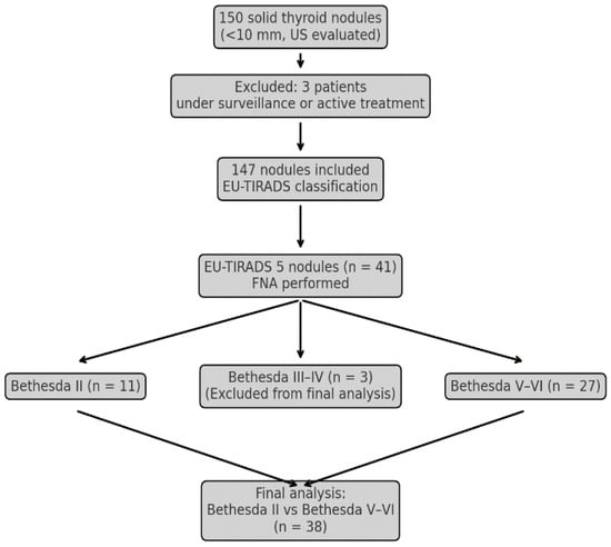 Nodules were classified according to the Bethesda system as benign (Bethesda II) or malignant (Bethesda V–VI). Patients with Bethesda I, III, or IV cytology results were excluded from the final analysis to ensure clear diagnostic classification. No patient with Bethesda II underwent surgery during follow-up, so histopathologic confirmation was unavailable for benign nodules.