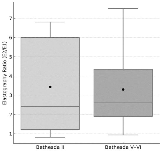 Box-and-whisker plot comparing the elastography ratio (E2/E1) between cytologically benign (Bethesda II) and malignant (Bethesda V–VI) thyroid nodules. Boxes indicate the interquartile range (25th–75th percentile), the horizontal line within each box marks the median, whiskers represent the data range within 1.5 × IQR, and black circles denote the mean values. No statistical outliers were detected in either group. Comparison by Mann–Whitney U test: p = 0.584.
