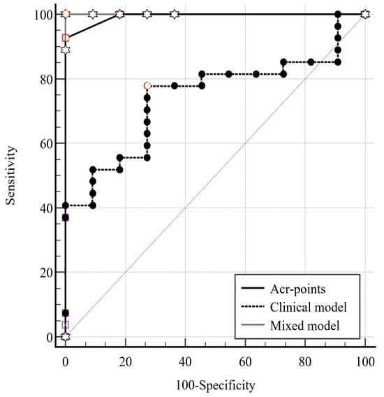 Finally, a “mixed” model was generated, combining the clinical characteristics mentioned above with the addition of the ACR scoring points. The mixed model was significant (p < 0.001, AUC 1.0, Youden Index:1) with a sensitivity and specificity of 100%. A pairwise comparison of the three models is illustrated in Table 3 and Figure 3.