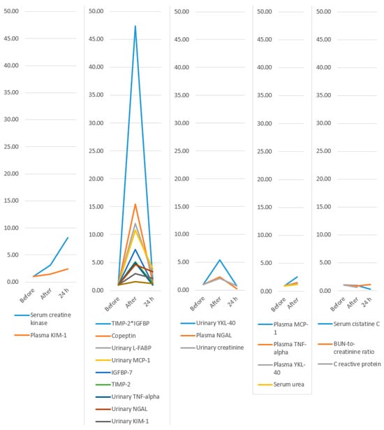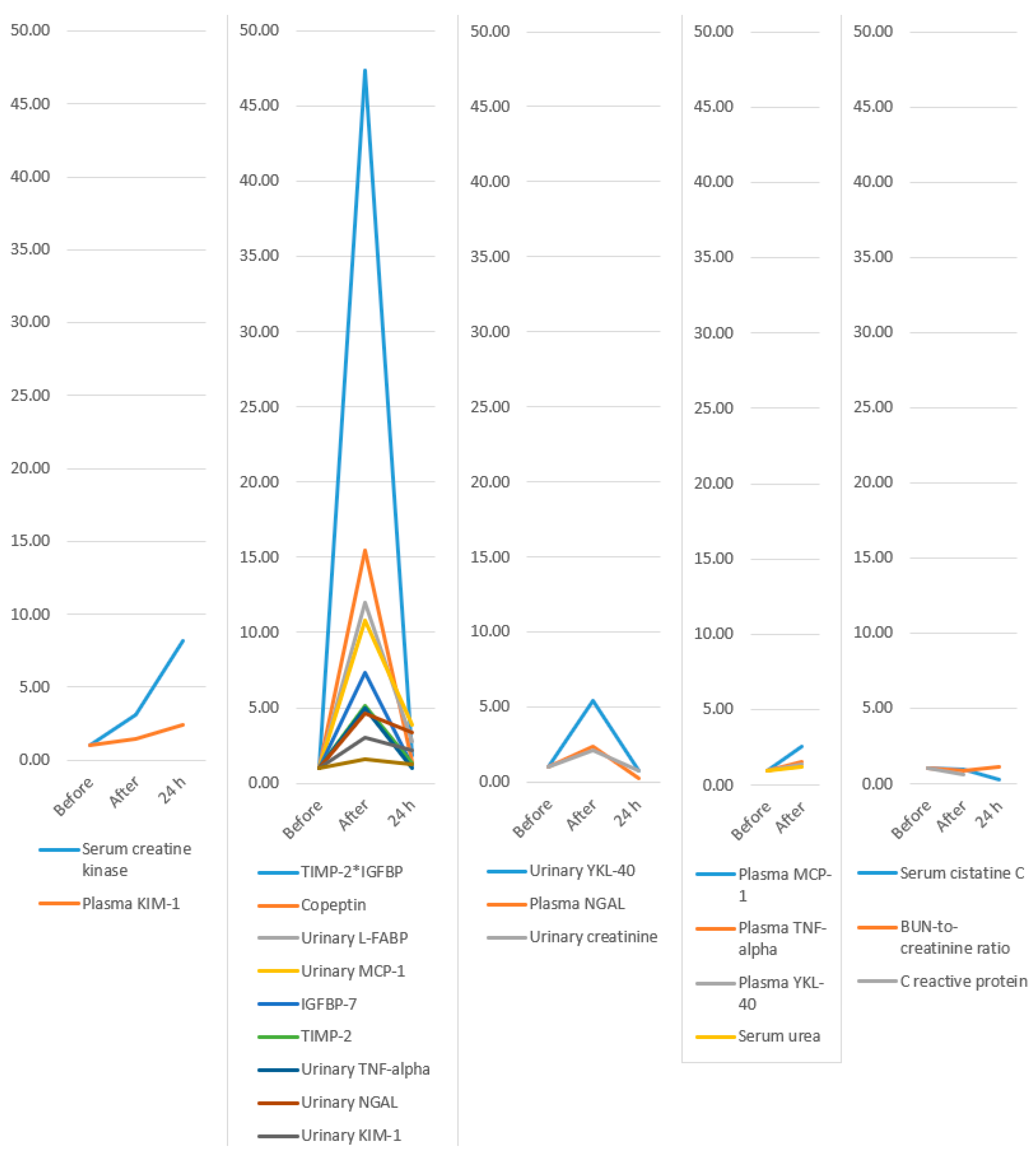 - Mansour, S.G.; Verma, G.; Pata, R.W.; Martin, T.G.; Perazella, M.A.; Parikh, C.R. Kidney Injury and Repair Biomarkers in Marathon Runners. Am. J. Kidney Dis. 2017, 70, 252–261. [Google Scholar] [CrossRef] [PubMed]
