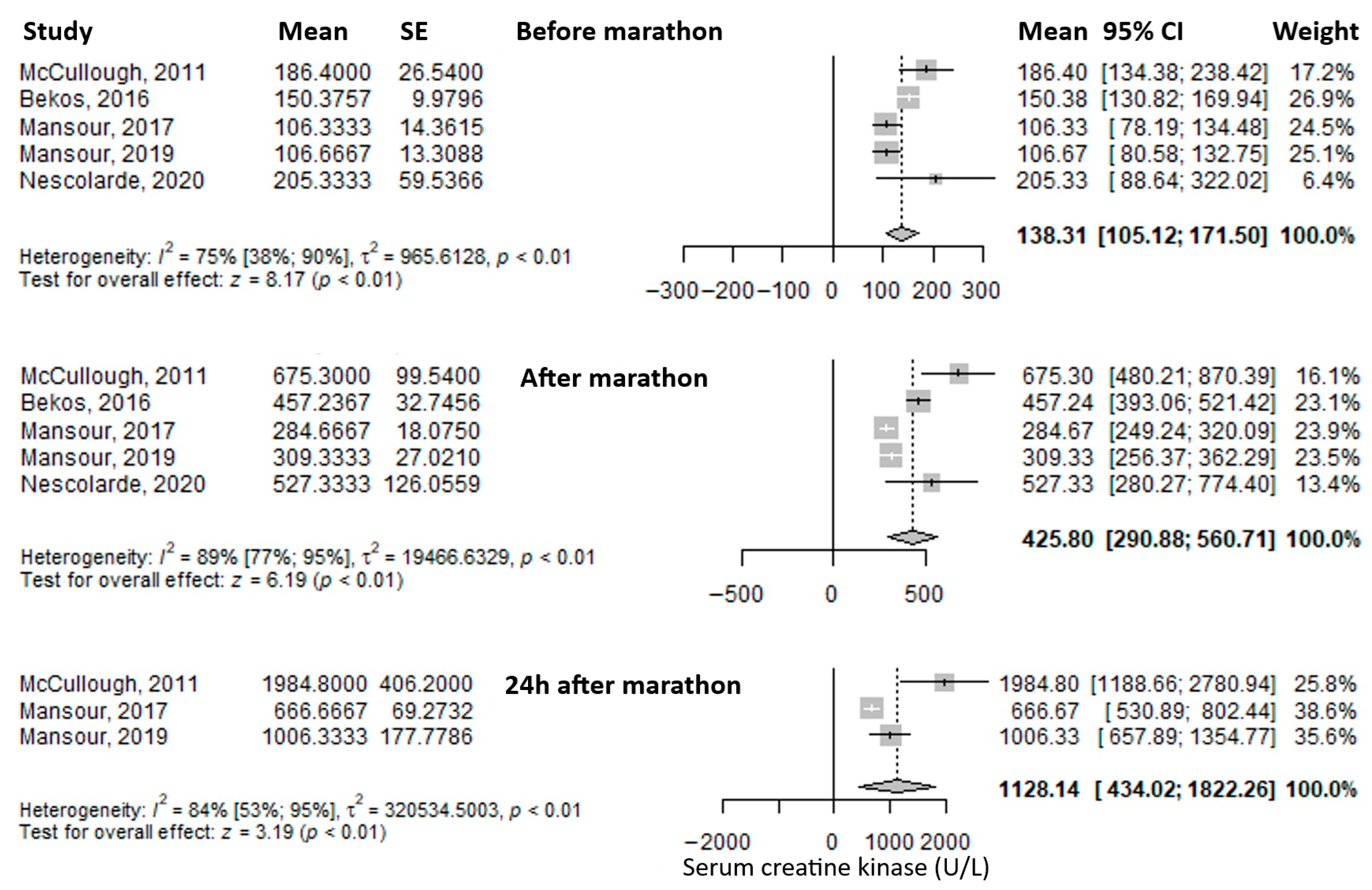 Increase post-marathon, further increase at 24 h | Serum creatine kinase | 1.00 | 3.08 | 8.16 |